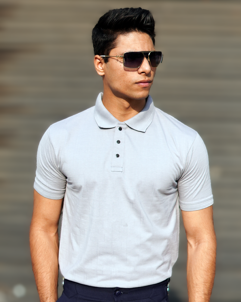 Gray Jacquard-Knit Polo T-Shirt With Button